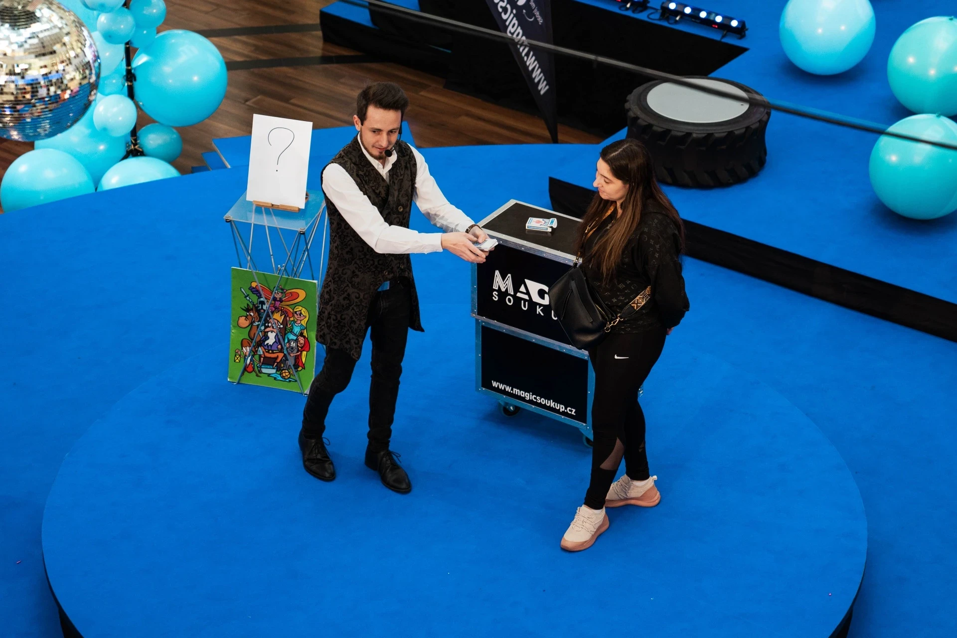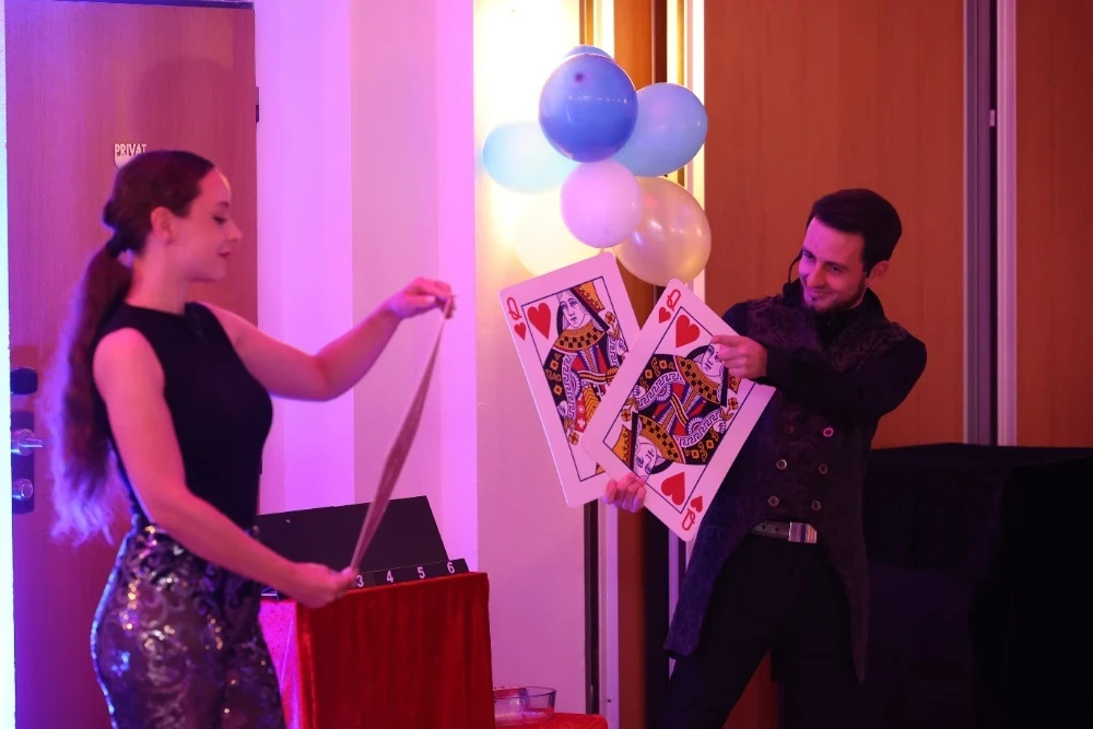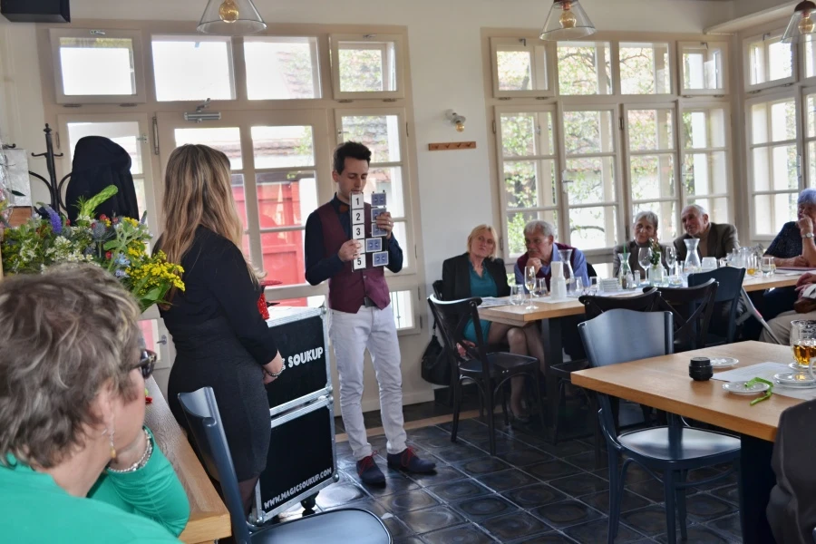 - Mikromagie u stolů: Dokonalý způsob, jak vyplnit čas během fotografování nebo po obědě. Triky s kartami, mincemi či telefony se odehrávají v bezprostřední blízkosti hostů, přímo pod jejich zvídavými pohledy.